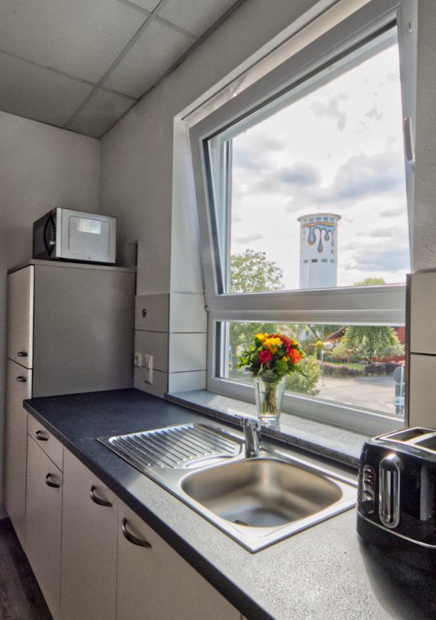 Large kitchen area for preparing and eating meals together; large table: 140/80 cm